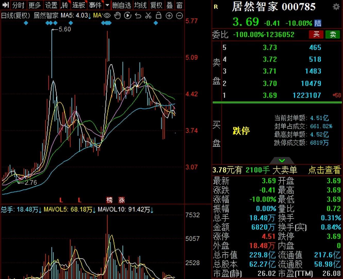 4月18日,受到汪林朋被留置影响,居然智家股价开盘即跌停,截至发稿,股价为3.69元/股,跌幅10%,总市值229.8亿元,TTM市盈率26.08。实际上,自更名以来,居然智家股价大涨大跌,波动较大,多次发布股票交易异常波动公告。