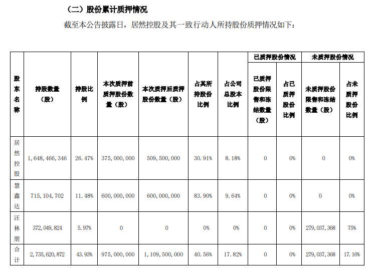 截至3月29日,居然控股、慧鑫达分别质押5.1亿股、6亿股,占其各自持股比例的30.91%、83.9%,质押用途是为居然控股融资提供质押担保。