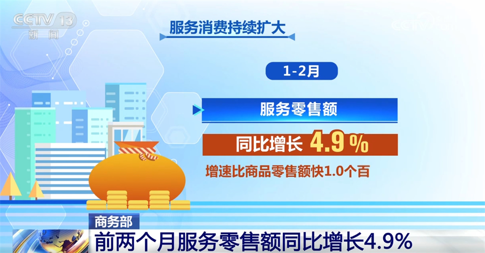 服务消费持续扩大。1—2月,服务零售额同比增长4.9%,增速比商品零售额快1.0个百分点,其中餐饮收入增长4.3%,旅游咨询租赁服务类、交通出行服务类零售额同比实现两位数增长。
